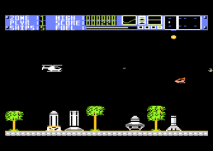 The game has 5 stages, and at the end of each stage a command center must be destroyed (earning an extra helicopter). These are the headquarters of rival computer companies of the time, namely Apple, Amstrad, BBC, Commodore and Spectrum. The game features end of level and end of game animations.