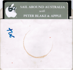 THe title screen in game says “Around Australia with Steinlager I.” The disk was found amongst a number of floppies, with a former school Apple IIe Platinum, which was purchased near Wanganui, New Zealand. A disk image can be downloaded from http://www.vintage8bit.com/content/sail-around-australia-peter-blake-apple